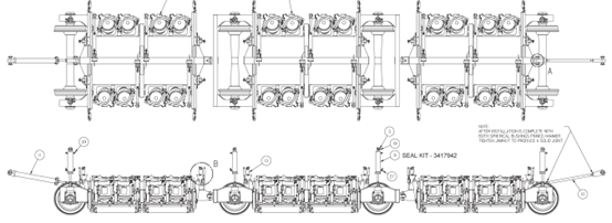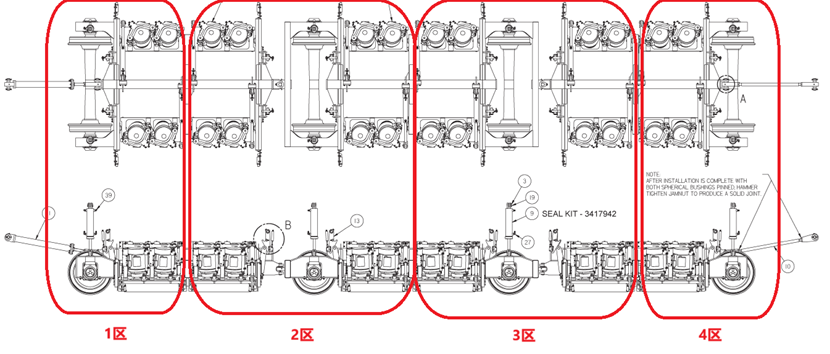 PGM96C鋼軌打磨車(chē)的作業(yè)小車(chē)由3個(gè)單元拼接而成,每個(gè)單元上安裝有8臺(tái)打磨電機(jī),即每臺(tái)作業(yè)小車(chē)共有24個(gè)打磨電機(jī),如圖一所示: