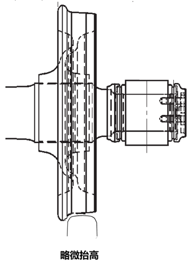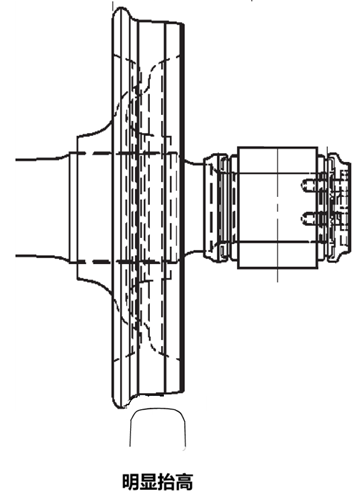 導(dǎo)向輪受進(jìn)給油缸的作用產(chǎn)生懸空效應(yīng)時(shí),其懸空的高度受打磨電機(jī)的角度、進(jìn)給油缸的下壓力大小以及砂輪厚度共同影響,并不懸空在固定的高度。圖三是正常狀態(tài)下的輪軌接觸狀態(tài),圖四是導(dǎo)向輪被略微抬高后的狀態(tài),圖五是導(dǎo)向輪被明顯抬高后的狀態(tài),圖五這種狀態(tài)易引起掉道。