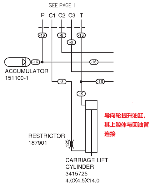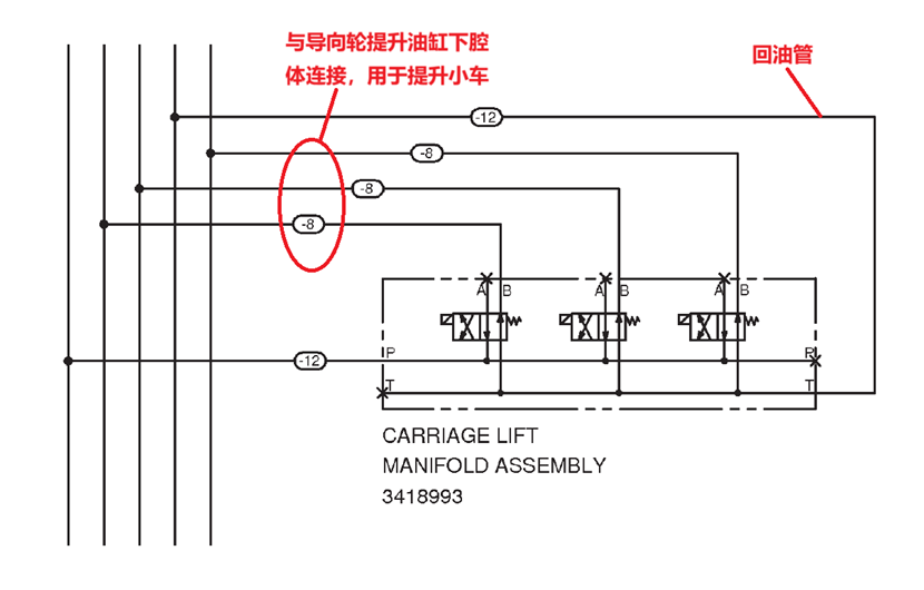 作業(yè)小車(chē)提升油缸控制閥是常見(jiàn)的兩位四通換向閥,其線圈在未得電時(shí),油缸的下腔體通過(guò)該閥與回油管連接,而上腔體是直接與回油管連接的,如圖六和圖七所示。因此,當(dāng)作業(yè)小車(chē)導(dǎo)向輪落到鋼軌上后,控制閥失電的情況下,提升油缸的上下腔體都與回油管連接,使作業(yè)小車(chē)處于自由懸浮狀態(tài)。