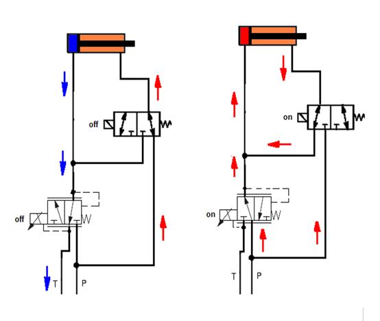 打磨電機(jī)的上下動(dòng)作動(dòng)力來(lái)源是進(jìn)給油缸,當(dāng)作業(yè)開(kāi)始后,激活閥和比例閥得電,其閥芯動(dòng)作后,將進(jìn)給油缸的上腔體油路與液壓泵引來(lái)的壓力管連通,此時(shí)進(jìn)給油缸的上下腔體同時(shí)受液壓泵壓力的作用,如圖八所示,左側(cè)油路是磨頭未激活的狀態(tài),右側(cè)油路是磨頭激活下壓打磨時(shí)的狀態(tài)。