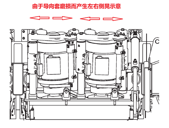 在上述基礎(chǔ)上,還可以引申出另一種較為隱蔽但可能影響打磨質(zhì)量的問(wèn)題,即導(dǎo)向套的磨損對(duì)打磨質(zhì)量產(chǎn)生影響。常規(guī)導(dǎo)向套的內(nèi)襯材質(zhì)是銅,導(dǎo)向桿是鋼材,這兩者在上下動(dòng)作過(guò)程中必然存在磨擦,由于材質(zhì)的原因,銅受摩擦后的消耗遠(yuǎn)大于鋼材。在一些使用多年的老車(chē)上可以觀察到,許多電機(jī)在下壓到最下端以及從最下端開(kāi)始上升的一瞬間,電機(jī)整體會(huì)產(chǎn)生左右方向上的側(cè)晃抖動(dòng),如圖九所示: